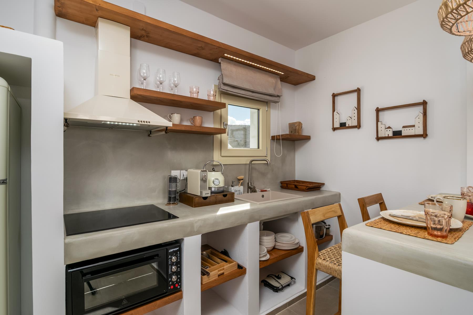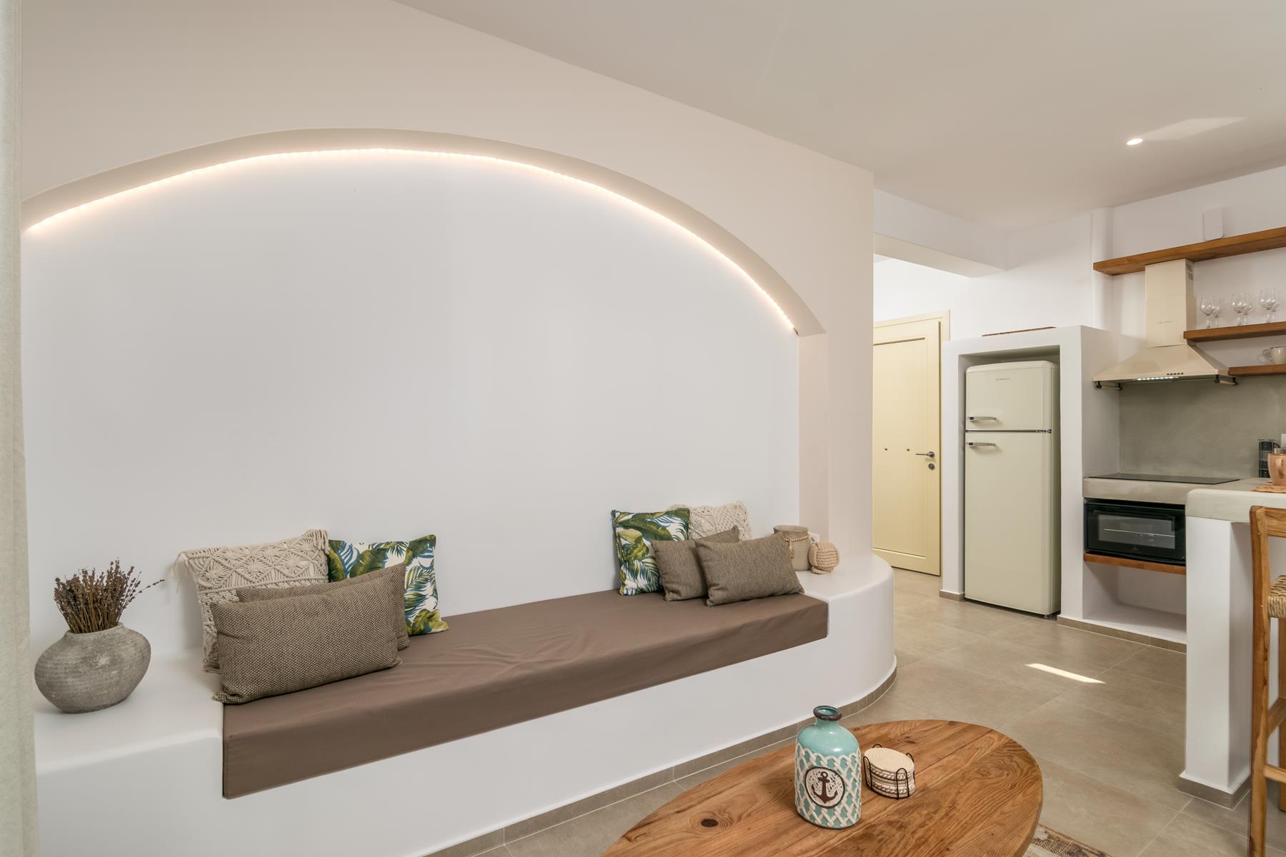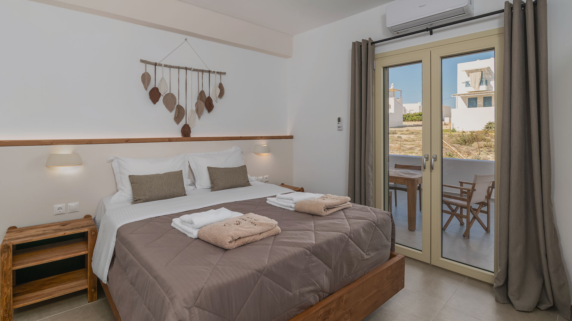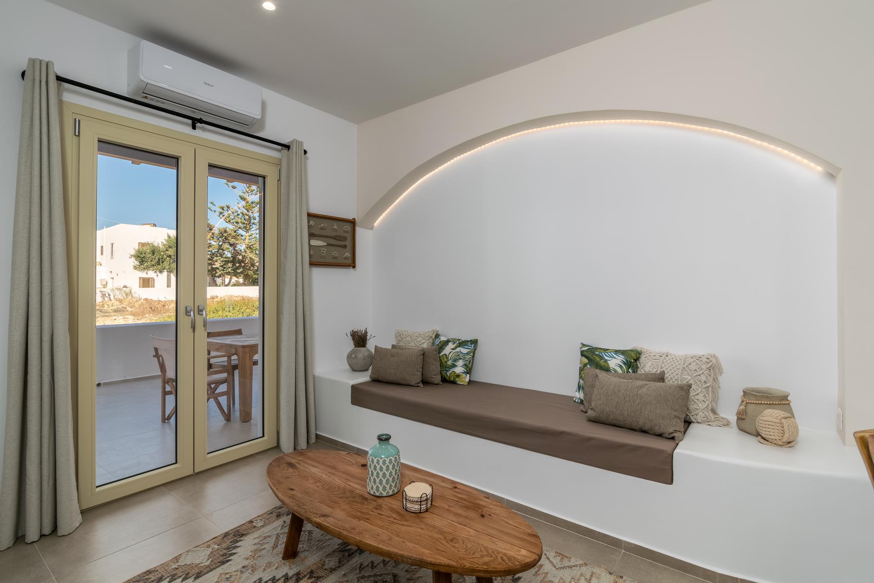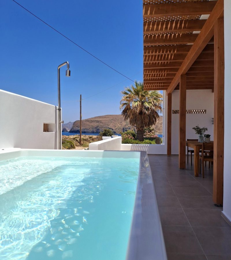 This spacious 75 m² family apartment, located on the ground floor, offers stunning sea views and a private plunge pool. With two bedrooms featuring queen beds, a comfortable living room with a sofa bed, and two bathrooms, it provides the perfect space for up to 5 guests. The serene setting, combined with modern comforts, creates an ideal retreat for families or friends looking to relax and enjoy the beauty of the Aegean.