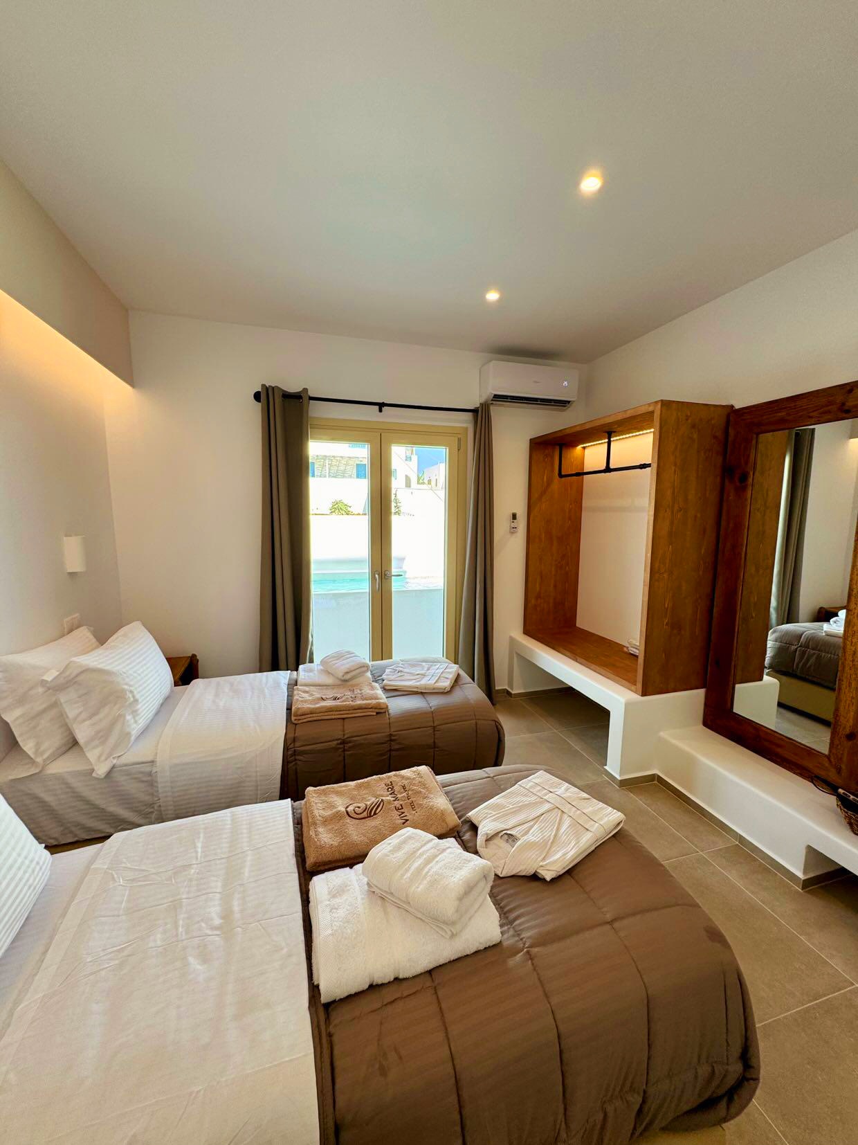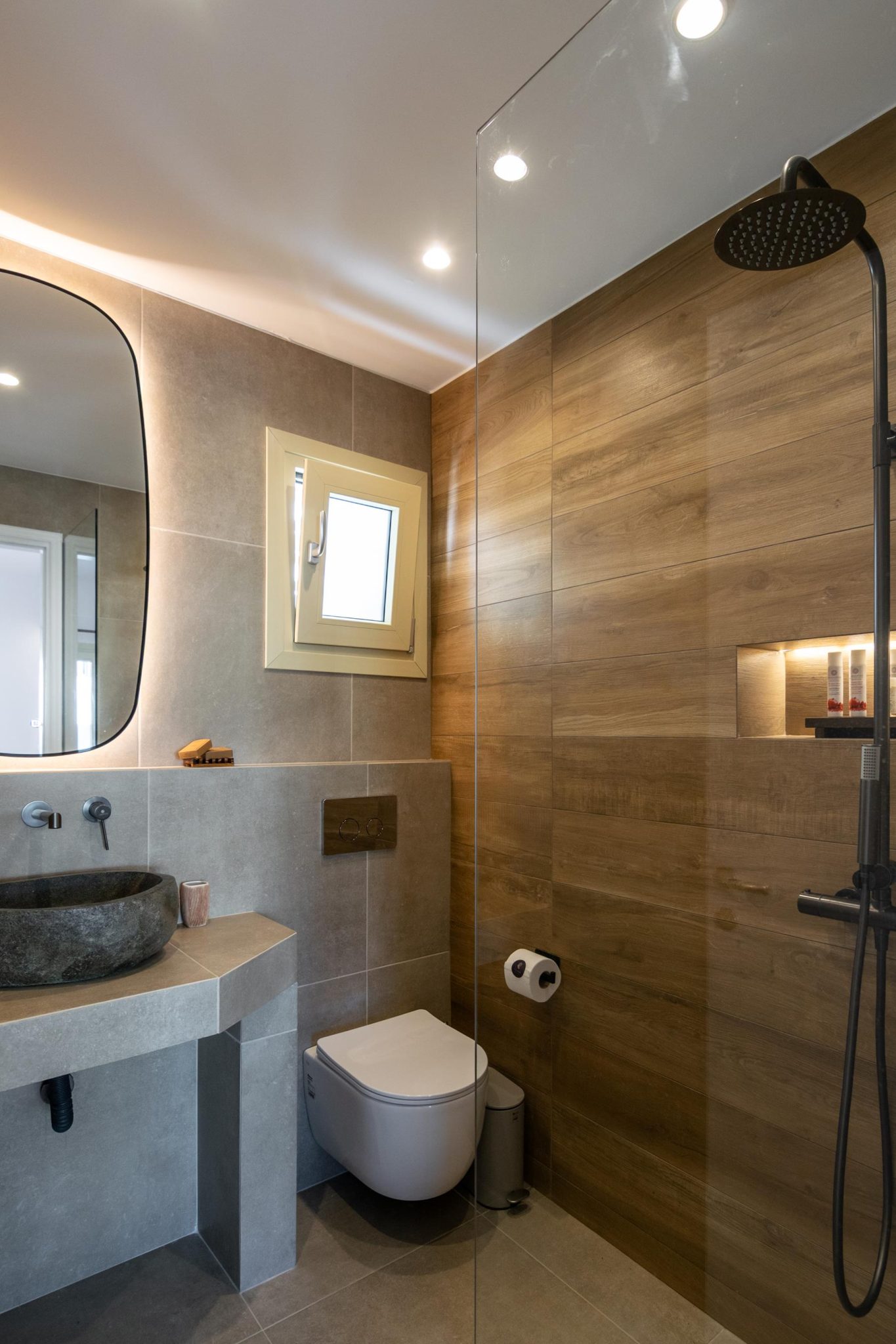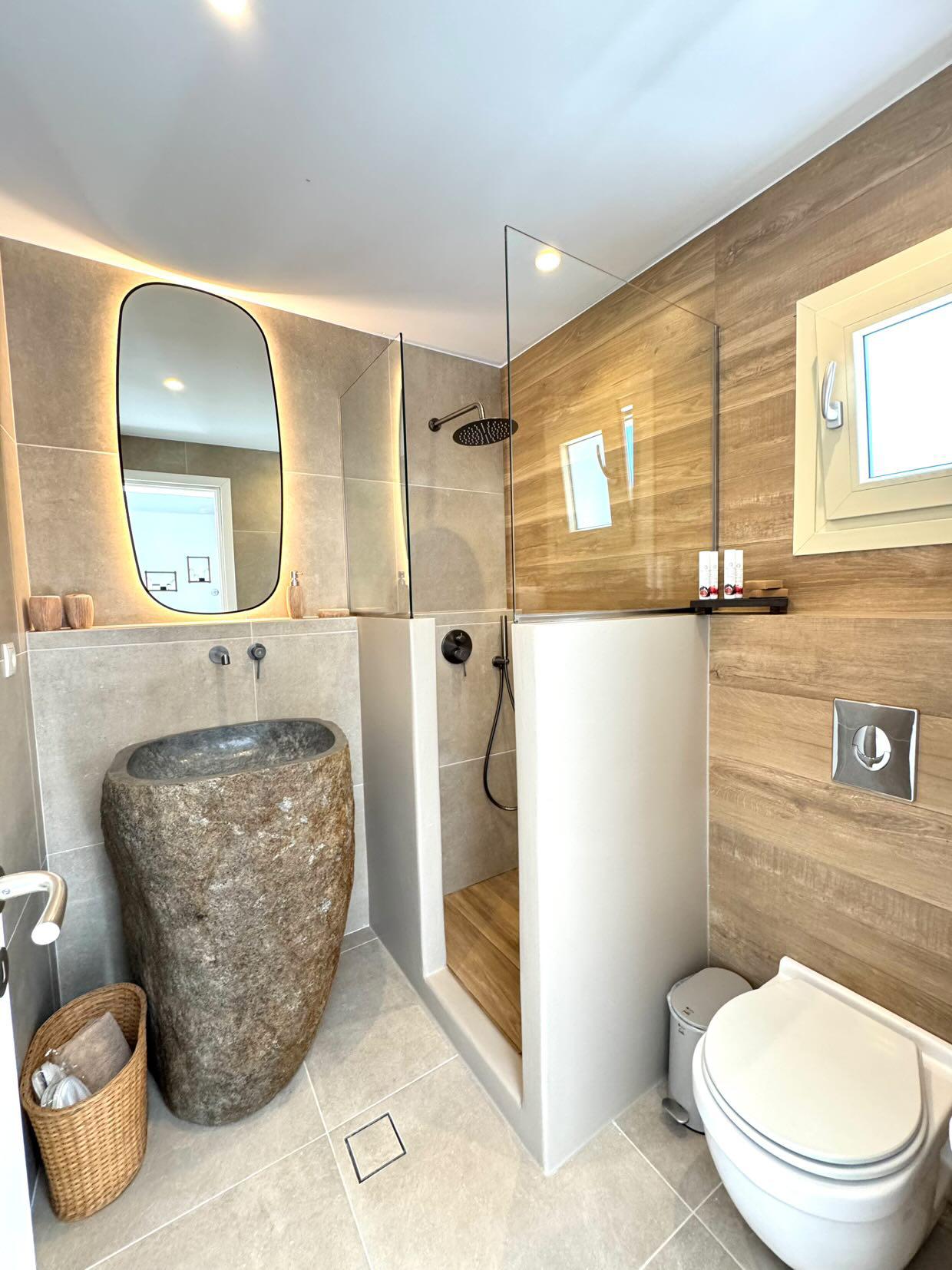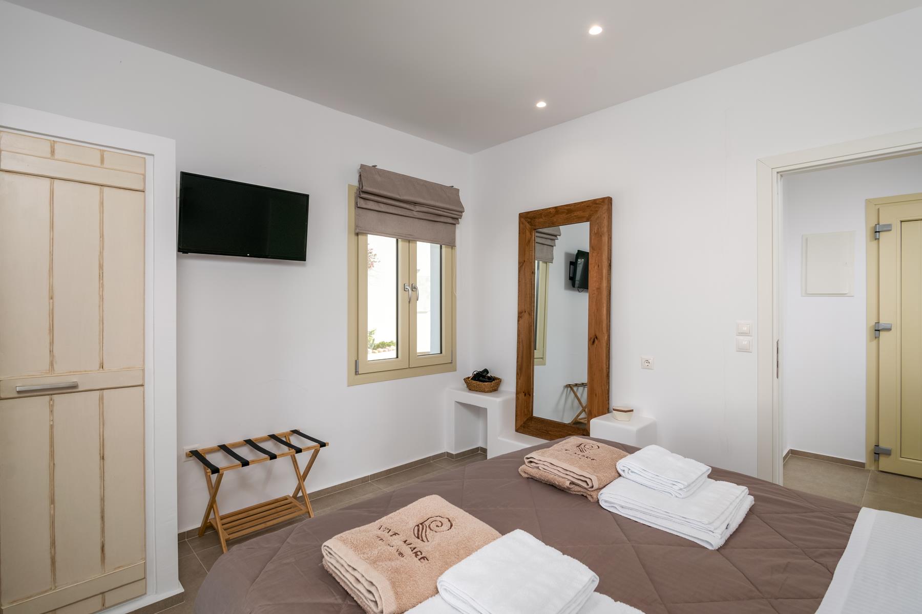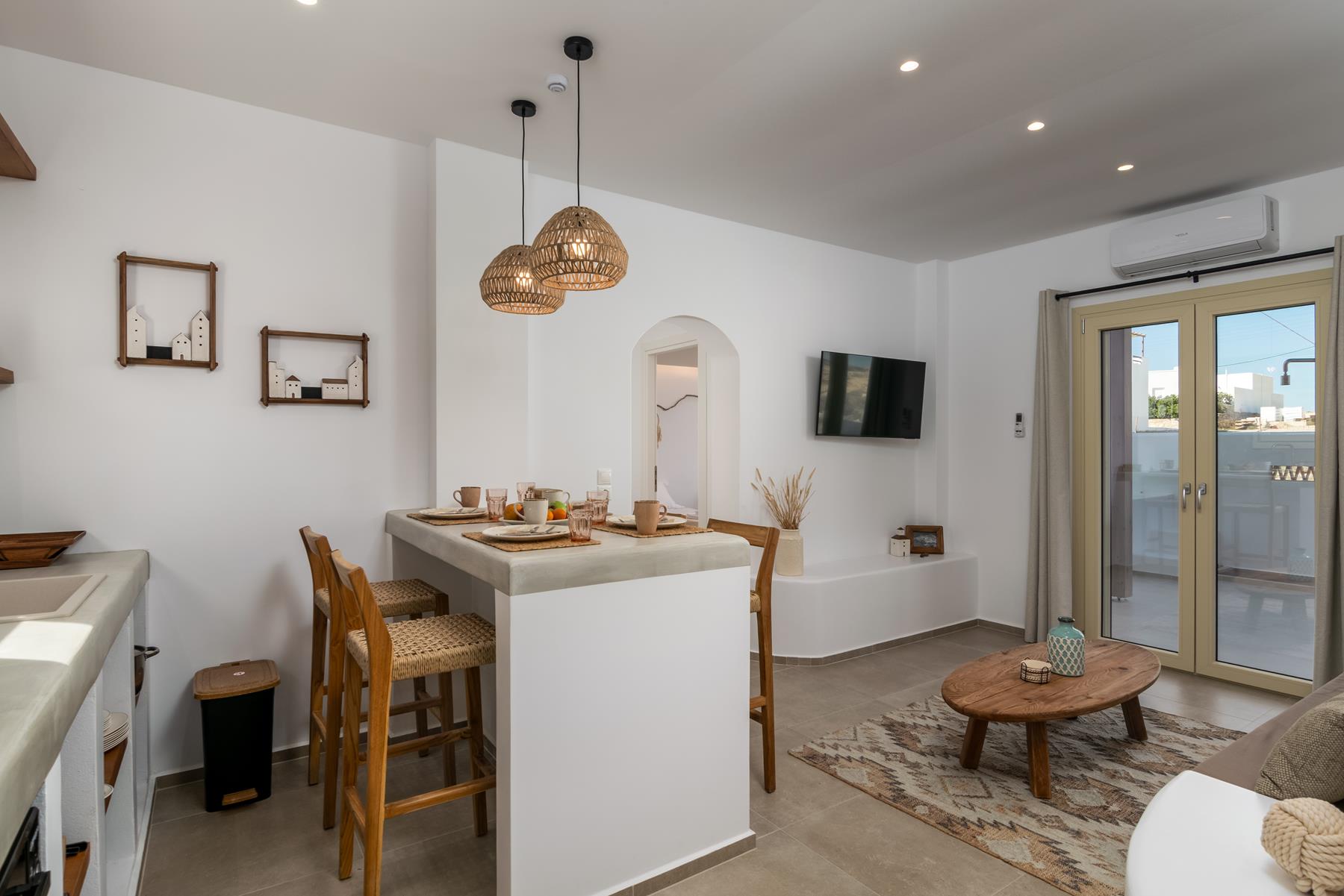 This spacious 75 m² family apartment, located on the ground floor, offers stunning sea views and a private plunge pool. With two bedrooms featuring queen beds, a comfortable living room with a sofa bed, and two bathrooms, it provides the perfect space for up to 5 guests. The serene setting, combined with modern comforts, creates an ideal retreat for families or friends looking to relax and enjoy the beauty of the Aegean.